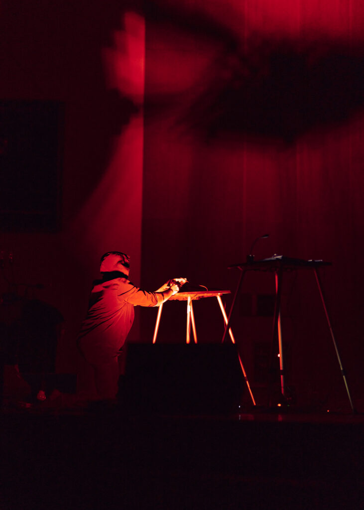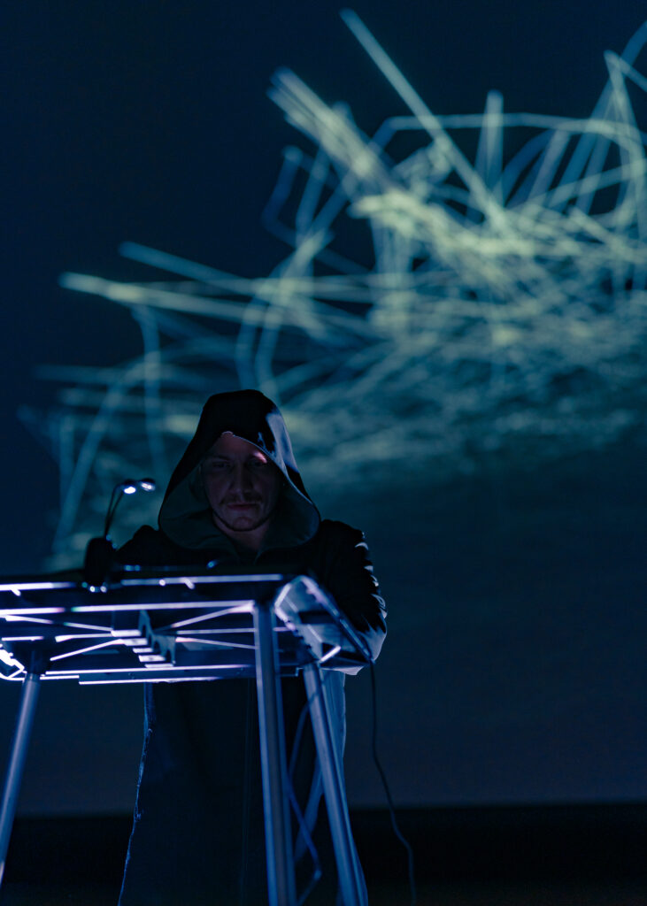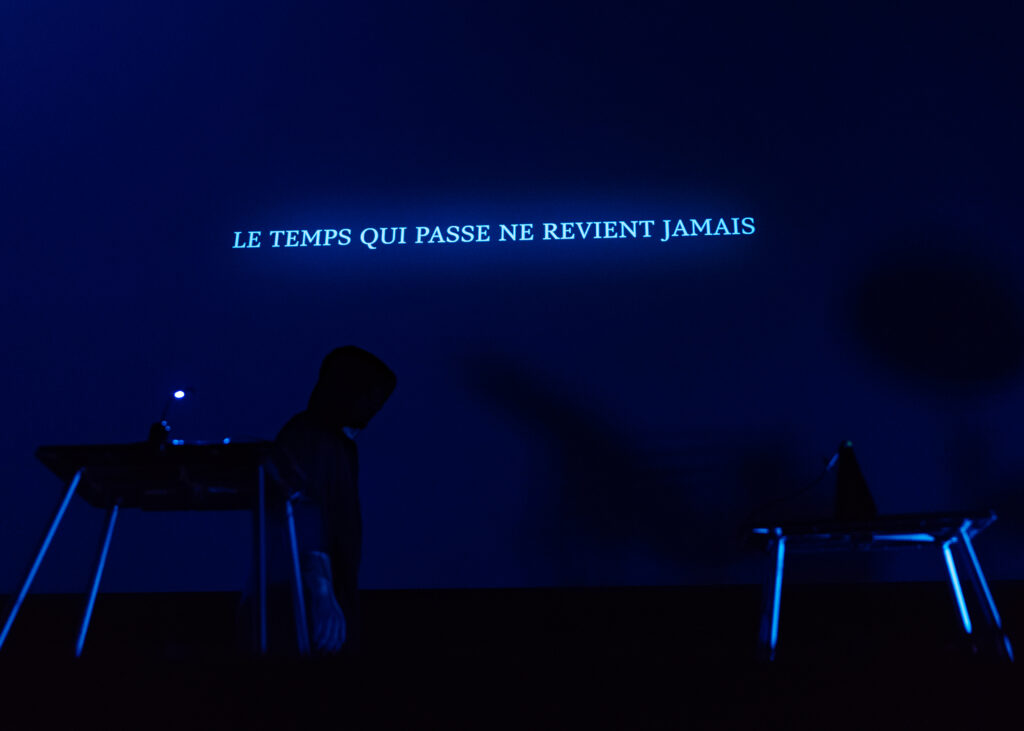 Chrono est une performance audiovisuelle qui allie jeux de lumières, traitement sonore en temps réel et projection vidéo. Inspirée par deux objets symboliques – une minuterie électrique industrielle et un métronome à pendule – l’œuvre interroge notre perception du temps à travers une approche à la fois esthétique et conceptuelle.