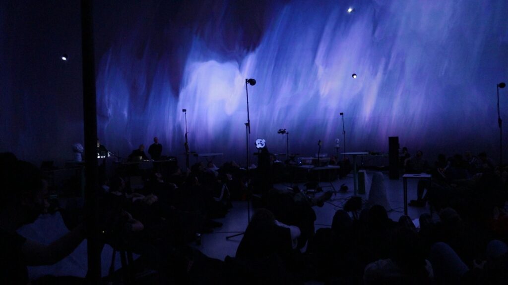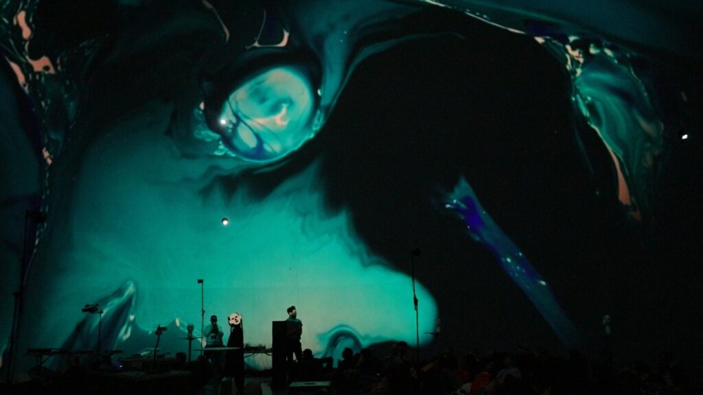 Regards is an immersive dome A/V performance exploring the human gaze and how we are perceived by others. Live liquid painting, processed in real time, forms an eye-like visual projected across the dome, while a dense spatial ambient score creates a dark, mysterious atmosphere. The audience can deepen the experience using bone-conduction headphones that transmit inner voices reflecting on perception, social judgment, and cognitive distortion. A mirrored, three-faced figure moves among the crowd, embodying the multiplicity of perspectives.